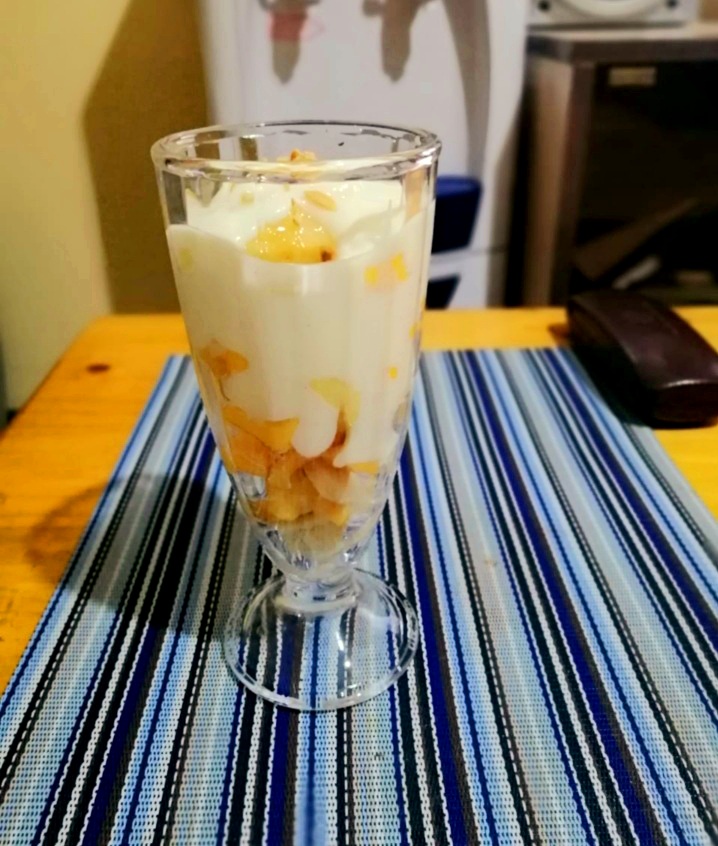 3. In a glass, put 1 tbsp. of yoghurt followed by 1 tbsp. of bananas and mangoes each and sprinkle on top with 1 tsp. of crushed groundnuts. Repeat this procedure in the same order until the glass is full.